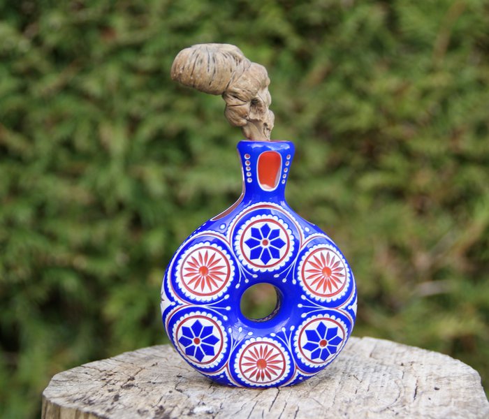 Überfangene Lochbixl sind rar. Dieses 3-fach überfangene Glasl (blau/weiß vor opalin orange) hat Günter Baumgartner geblasen. Mit dem Diamantrad geschliffen mit zweierlei Sternmustern in Ringen auf Vorder- und Rückseite und Sternen in der Raute auf den Seiten hat es Karl Weghofer. Der hohe Glanz wird durch gründliches abschließendes "borsteln" (polieren) erreicht.