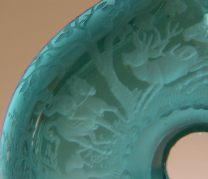 Auf ein transparentes türkisgrünes Ringbixl hat der Graveur rundum eine Jagdgesellschaft ganz filigran geschnitten. In einer von Laubbäumen geprägten Landschaft tummeln sich Jäger zu Pferde mit Speeren und Jagdhorn, dazwischen Jagdhelfer, die eine erlegte Wildsau auf einer Stange transportieren sowie flüchtende Wildschweine, Rehe und Hirsche. Eine einmalige Miniatur ! Johannes Straub ist mit diesem Büchsl ein Meisterwerk gelungen. Dazu passend ist das Bixl mit einer Gehörnspitze verschlossen. Die Rückseite des Glasls ist plan geschliffen.